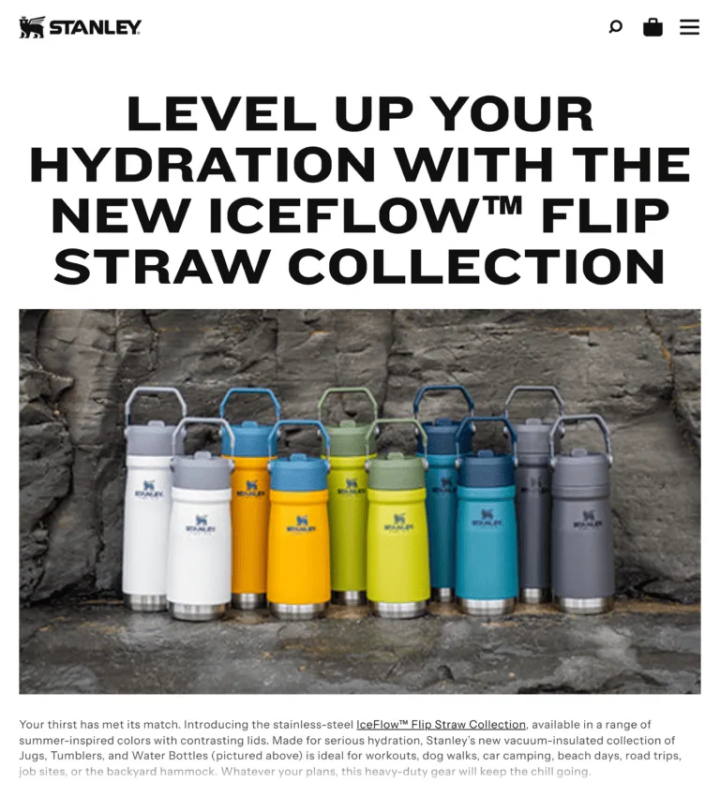 对比之下:Stanley是一家以生产高品质保温杯和水壶闻名的美国品牌,深受户外爱好者和日常用户喜爱。他们用Level Up Your Hydration With The New IceFlow™ Flip Straw Collection(用新款IceFlow™翻盖吸管系列升级你的水杯)吸引了已经了解该品牌的用户。