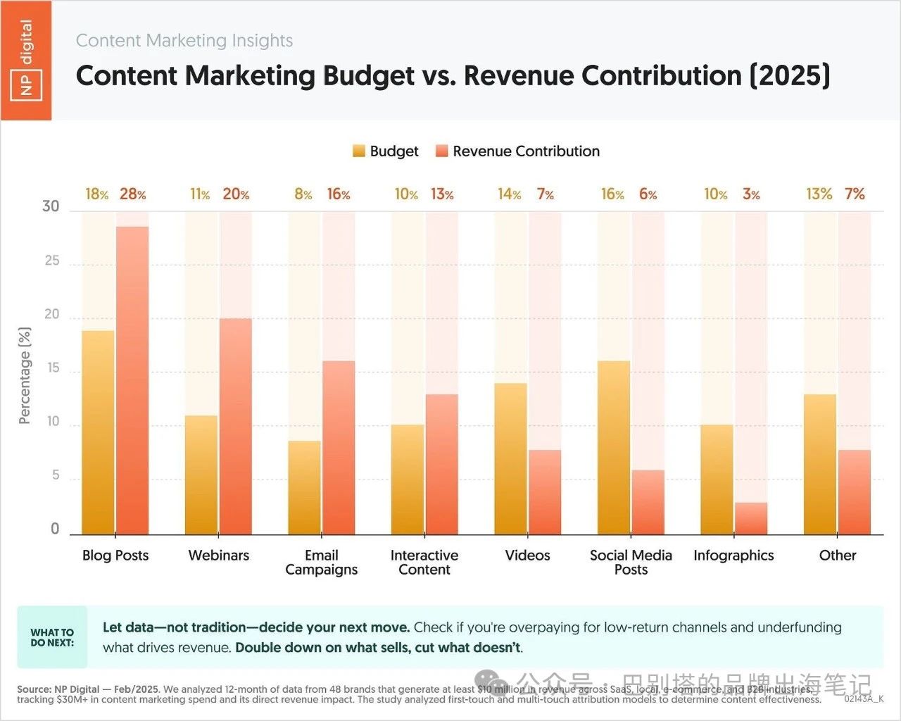熟悉品牌出海的小伙伴们应该对Neil Patel 团队不陌生,他们一直多年专注于数字营销研究与实践,创始人尤其擅长SEO和内容营销领域。 25年2月,他们和北美48家品牌公司合作,对超过3000万美元的内容营销投入进行深入研究,分析不同内容形式在预算与营收贡献上的差异。包括常见的Blog博客、Webinars研讨会、EDM邮件营销、互动内容、视频、SNS社交媒体发帖和信息图等多种内容形式。