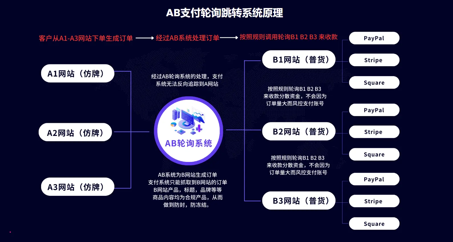 我们的 AB 跳转支付轮询系统,采用中间跳转 + 网关架构,通过多层数据中转 + 反爬虫防护,从技术底层切断支付平台对实际卖货站(A 站)的溯源链路。