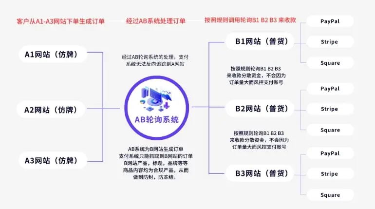 系统内置引导爬虫机制:实时抓取 B 站(普货站)的合规商品数据,同时屏蔽 A 站(仿牌 / 非合规站)的数据抓取;再配合商品替换技术,并深度适配 Stripe、PayPal 等多类支付接口,让支付系统平台(Paypal/Stripe)抓取到的订单信息,始终是 B 站的合规产品数据。